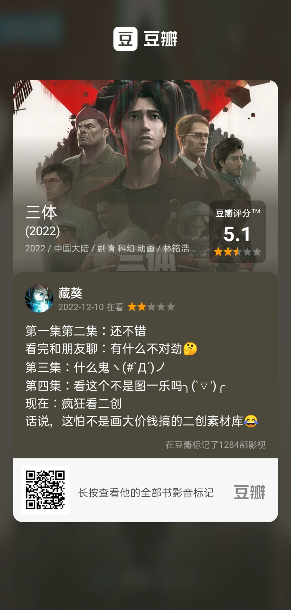 本報評論:我以前挺喜歡藝畫開天的,因為瘋味英雄和幻境諾德琳。後來這個感覺慢慢淡了,因為靈籠後半段不知道為什麼有一種說不上來的怪,但是接下還要三體動畫,因為曾經的感覺我還是有點期待的。現在——看我豆瓣評論吧你說畫這麼多錢怎麼就出一個這樣的玩意?不——我懂了!三體動畫是二創素材,UP主做鬼畜惡搞,這就是」三體宇宙「