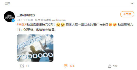 《三體》動畫官方宣布《三體》動畫的追番量突破700萬, 感謝大家一路以來的陪伴與支持