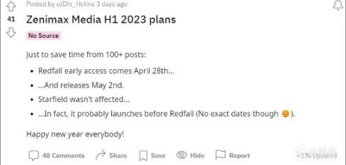近日Reddit上一名玩家曝光了B社母公司Zenimax Media 2023年部分計劃,其中還提到兩款重磅遊戲《紅霞島》和《星空》的發售日期: