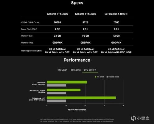 英偉達官方現已公布RTX 4070 Ti的部分參數,其擁有7680 CUDA核心,加速頻率可達2.61GHz,比 RTX 4080/4090高 100MHz,顯存為12GB GDDR6X,核心規格與被取消的RTX 4080 12G相同。性能方面,英偉達將RTX 4070 Ti和 RTX 3080 12G 進行了對比,在2K畫質設定下,開啟幀生成的RTX 4070 Ti性能大幅領先RTX 3080 12G。