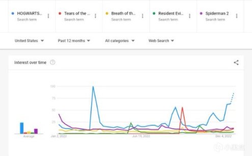 數據顯示,《霍格沃茨之遺》成為2022年中被搜索次數最多的遊戲,搜索次數在《塞爾達傳說:王國之淚》和《漫威蜘蛛俠2》之上: