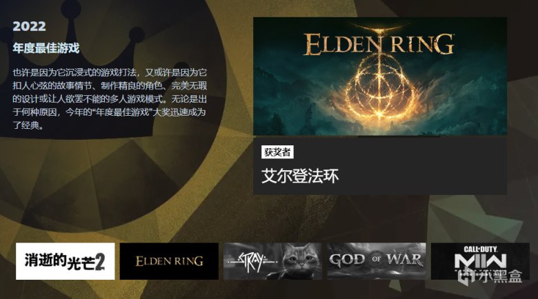 恭喜《艾爾登法環》獨占兩元,成為2022 年Steam大獎最大的玩家。2022年剛過,根據相關遊戲媒體的統計,《艾爾登法環》已經獲得了281個由專業評委選出的年度大獎,觀眾選擇投票選出的有43個獎。如果這兩個數字相加,《艾爾登法環》在一年的獲獎數量,已經超過前輩熱門大作《最後的生還者2》了,當之無愧的年度「爆款」。