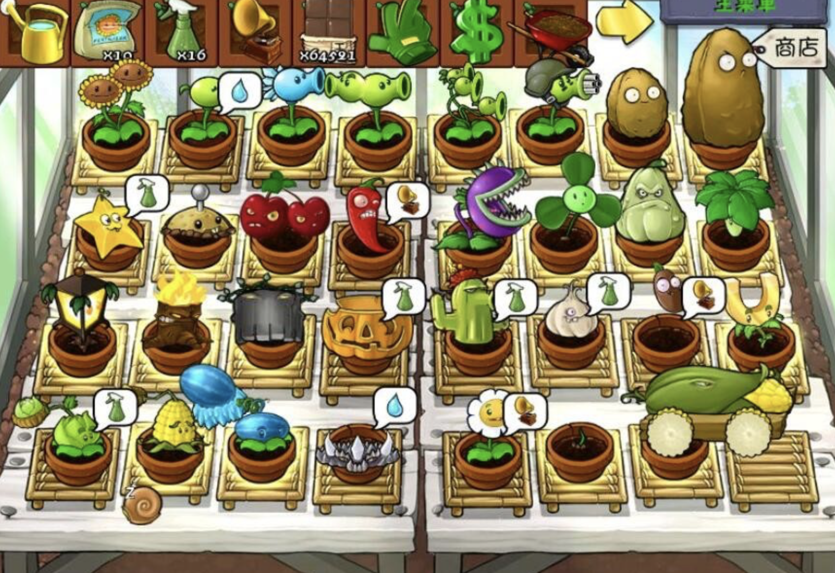 當然,如果覺得無盡模式或者多周目冒險模式過於緊張和勞累,《植物大戰殭屍》也有各種模式的小游戲可供通關後感到無聊的玩家消磨時間。最有名的自然要數禪境花園,這個可以養花養蝸牛還能收資源(金幣和銀幣)、種大樹(智慧樹)的佛系放置小游戲給很多玩家都留下了極深刻的印象,甚至有不少人為了這個模式去開修改器的,可見這個模式的吸引力之大。當時玩盜版的我為了能體驗這個模式帶來的樂趣,沒有開修改器,而是沒事的時候就會打開游戲去禪境花園看看,給植物澆水殺蟲聽音樂,撿撿金幣銀幣,給蝸牛喂巧克力,伴隨著恬淡的BGM,確實很有禪意。可惜的是之後換電腦就再也沒有然後了,補票之後也沒怎麼玩以至於花園還沒開,不過每當回想起腦海里那段玩盜版《植物大戰殭屍》的時光,給我印象最深的還是那個充滿佛系氣息的禪境花園。