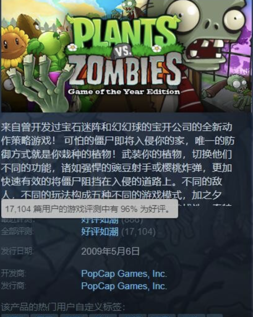 說到堪稱童年回憶的經典游戲,每個人的回答可能都各有不同。不過即便是眾口難調,但有一款游戲,用「回憶」和「經典」這兩個詞來形容它估計很少會有人反對,那就是《植物大戰殭屍》。我和很多玩家一樣,在十年前就玩過這款游戲——當時大多數人玩的都是盜版,我也不例外,前段時間才在Steam補票。盡管Steam上的正版沒有中文,游戲體驗還不如直接漢化好了的盜版,但《植物大戰殭屍》在Steam國區上的好評依舊如潮,可見這款游戲的魅力。