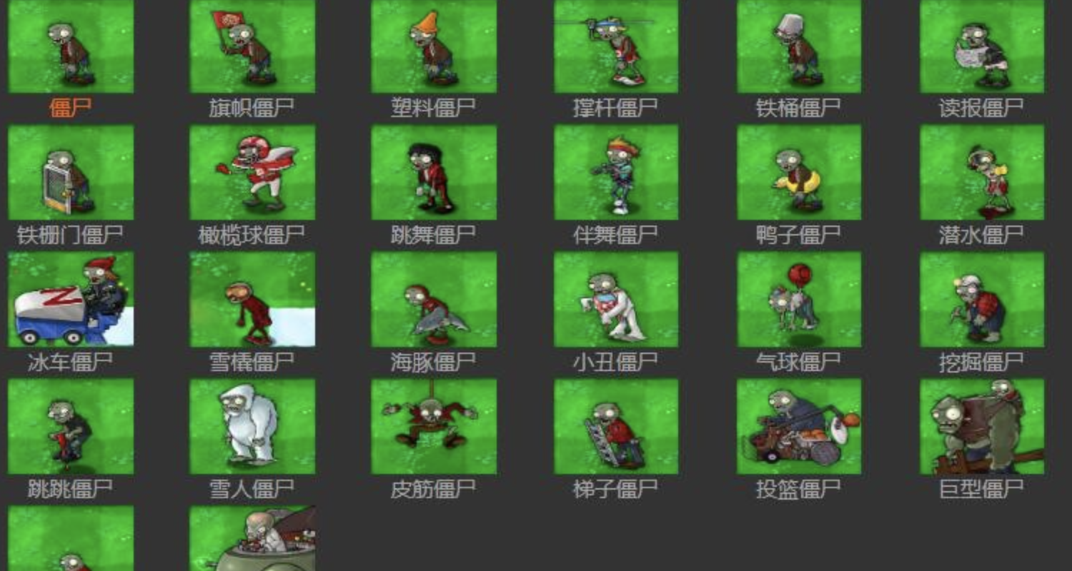 與植物種類的豐富程度相對應的,是殭屍的種類同樣非常豐富。和不同植物有著不同的能力一樣,不同的殭屍也有著各自的絕技。頭頂路障和鐵桶的殭屍防禦高,堪稱前期大肉盾;小丑殭屍死的時候會自爆,導致范圍傷害;撐桿跳殭屍可以越過他碰見的第一個植物,等等。不過,不同的殭屍也有相應的剋制它的植物,比如磁力菇能吸走小丑殭屍的爆炸盒子,高堅果可以阻止撐桿跳殭屍越過,這就讓玩家可以有針對性的採取對策。豐富的殭屍種類和植物一起構成了游戲的策略體系,讓玩家在不同種類的植物和殭屍之間相生相剋的關係中尋找對策,大大增加了游戲可玩性和游戲的策略深度。