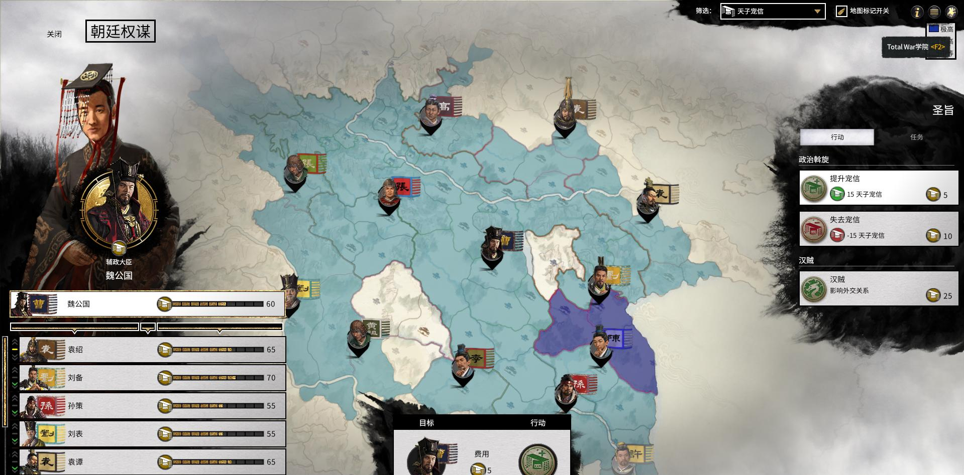 對於挾持了天子的曹操而言天子寵信還有更強大的用處。掌握了天子的人可以一次性消耗大量寵信宣布一個派係為漢賊,煽動各路諸侯對其群起攻之,甚至還能以天子之名直接頒布聖旨,在外交中奪得絕對的話語權。