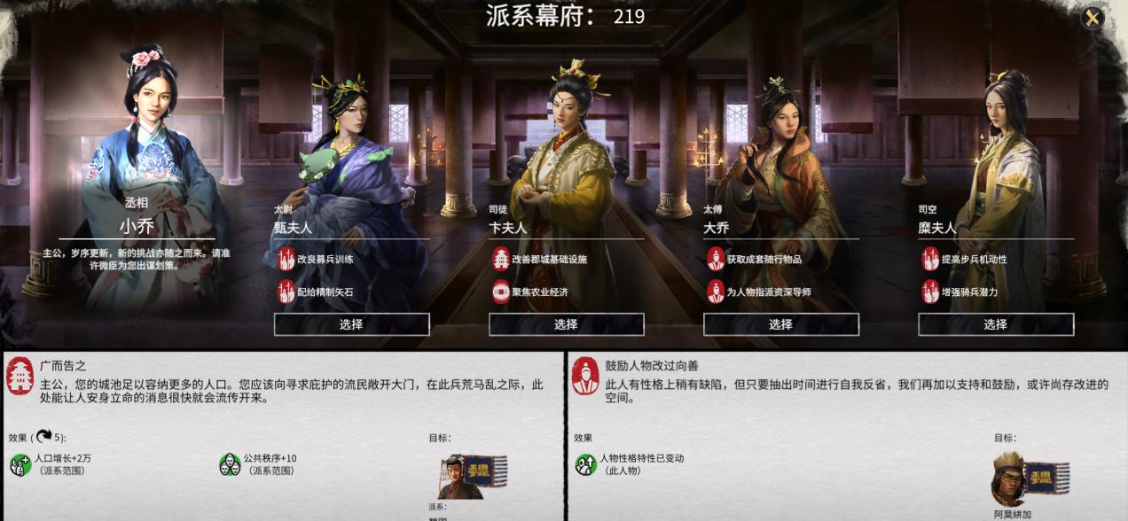 沒啥存在感的派系幕府全面升級,現在每年春季都能召開幕府會議,其中的幕府建議更加強大並充滿趣味。有的能僱傭海盜奇襲對手後方,有的能讓全部郡國放棄工商業、全力投入農業發展。眼饞兒子袁熙的妻子甄姬?你甚至能通過幕府建議直接將她拐過來作人質。
