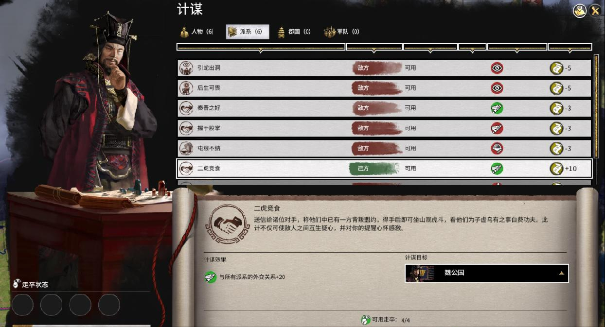 曹操默認擁有四個走卒用以施展計謀,每個計謀都會消耗或增加信譽,並附帶強大的功能。計謀的對象分為人物、派系、郡國、軍隊,可以根據戰場形勢靈活選擇。例如你可以安插耳目在敵軍中散布兵力充足的謠言,從而降低敵方徵兵效率;或者給諸侯們寫信,告訴他們其中一人背叛盟約,在坐觀虎鬥的同時還能受到他們的感激、增加自己的信譽。