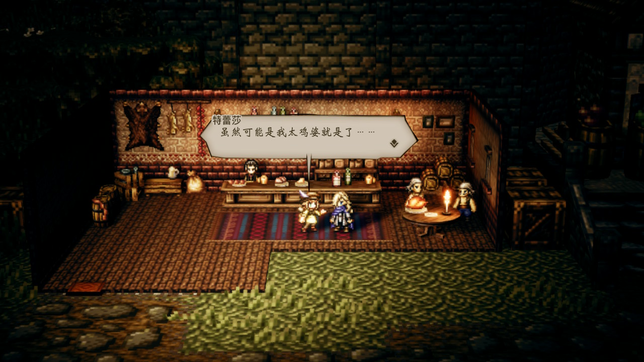 相比老前輩,《八方旅人》做到的不僅僅是傳承,更有突破,最明顯的當然就是分支的主線數量多達8條。在8條主線中各個主角的故事並沒有太多的交集,這也是本作的劇情為人所詬病的一點,但其實就算沒有開啟真結局,作者仍然為玩家增加了大量隊內角色的互動劇情,有時在酒館甚至可以觸發三人互動的劇情。這些互動劇情從一定程度上增加了在遊戲過程中各個角色之間的聯系,也讓玩家可以更好地理解各個角色在這個「8人豪華旅遊團」中的定位和每個人的特性。