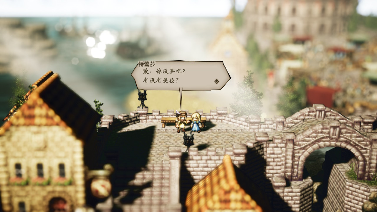 另外在《八方旅人》的畫面表現中還運用了大量的新技術,攝影級的景深、復雜的光效設計、照片級別的水面紋理等等,這些頂級大作中才會出現的畫面都體現在一個復古的像素遊戲中,實在讓人不得不驚訝。誠然遊戲的畫面更像是對JRPG黃金年代的致敬,但是其中的創新和突破也確實讓人感嘆。