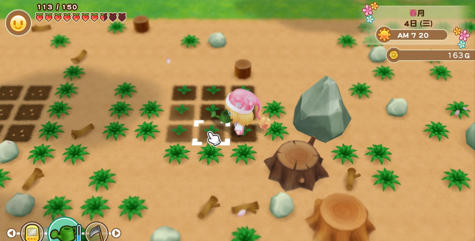 在遊戲中玩家將扮演一名牧場的主人,從零開始打造經營自己的牧場。玩法上也比較簡單,剛開始都是基本的除雜草、挖田、播種、澆水操作,如果熟悉種田玩法的模擬經營遊戲玩家應該可以快速上手。若是覺得前期經營困難的玩家,也可以選擇簡單模式遊玩,在簡單模式下玩家初始擁有大量金錢,農田也種好了作物,出貨時獲得的報酬也會比普通模式要高,這樣就可以提早擁有足夠金錢到鎮上購買雞、奶牛等畜牧了。