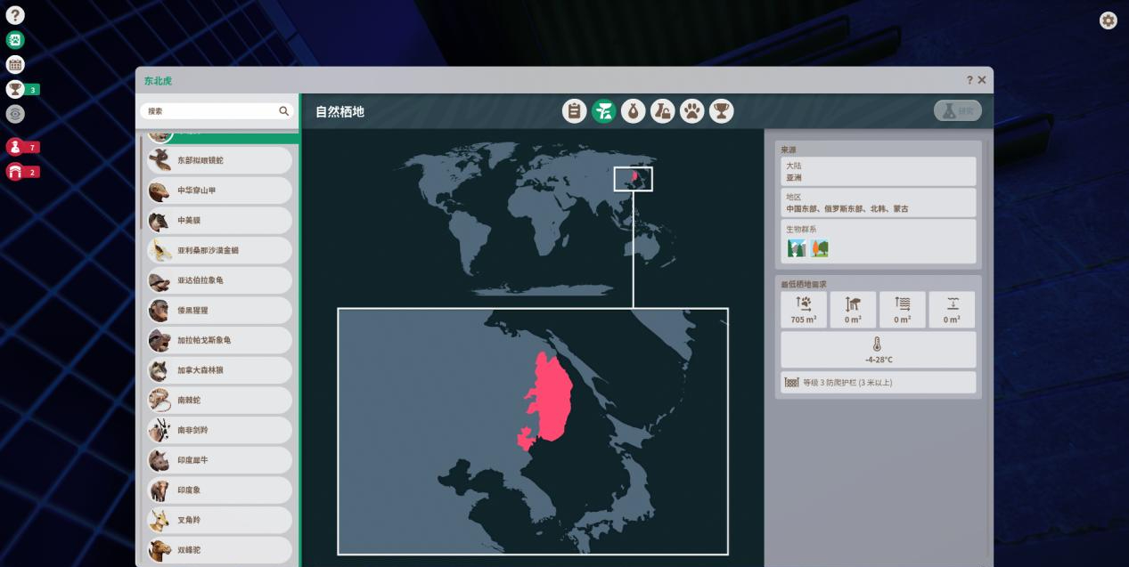 在將動物放入園區之前,我們需要為動物打造合適的棲地環境。而這一點,需要玩家學習和了解你所負責動物大自然中真實的棲息環境。