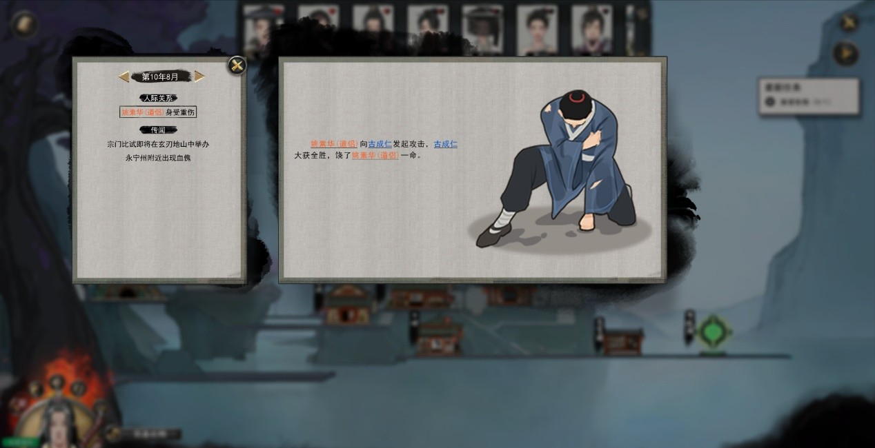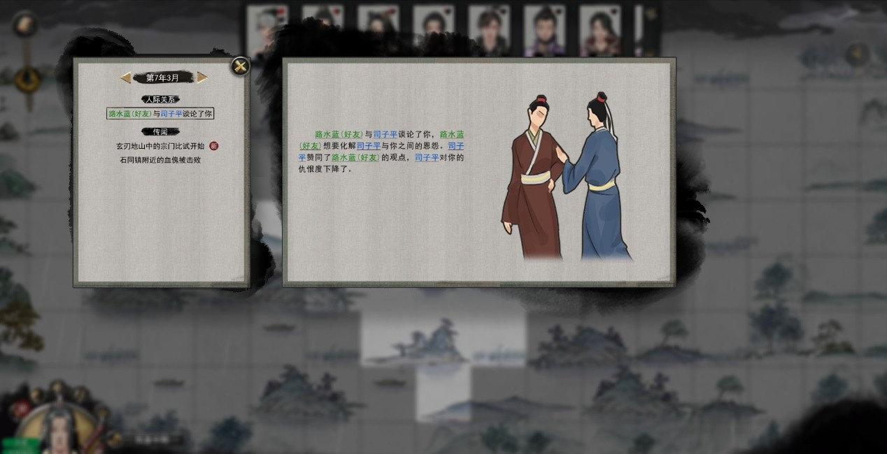 而最重要的還是「修仙就是修人脈」這條。本作的NPC每月也會自行行動,找玩家討取道具也好攀談也罷,甚至還有提出雙修的,而和玩家之外,NPC也會爆發沖突,勝敗皆有可能。正如前文所說,本作目前內容雖然少,但是人物交互是本作重點之一,仇恨系統更是重中之重。對於玩家,起碼在前中期還不能靠禮物洗腦的情況下,看到對面有個高境界的爹媽師傅老婆道侶還是只能該慫就慫,否則必被連環追殺,甚至連自己的道侶都有可能強出頭而暴斃;而對於NPC也差不多,如果玩家境界較高又不和人結仇,那玩家的親朋好友就算主動出手也多半能活命而歸。