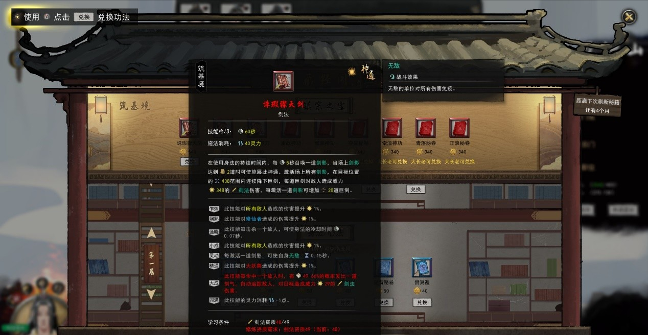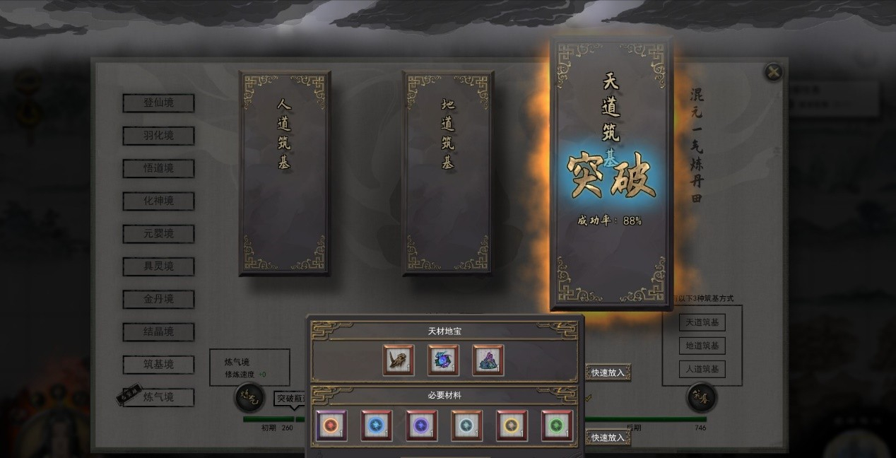 而提及修仙小說的經典設定,財侶法地目前也只有前兩者得到了體現,靈根資質目前僅僅作為一個修行技能的門檻而不提供修行速度的加成,風水寶地和道場也是遙遙無期——畢竟連宗門的設計都還沒完成。
