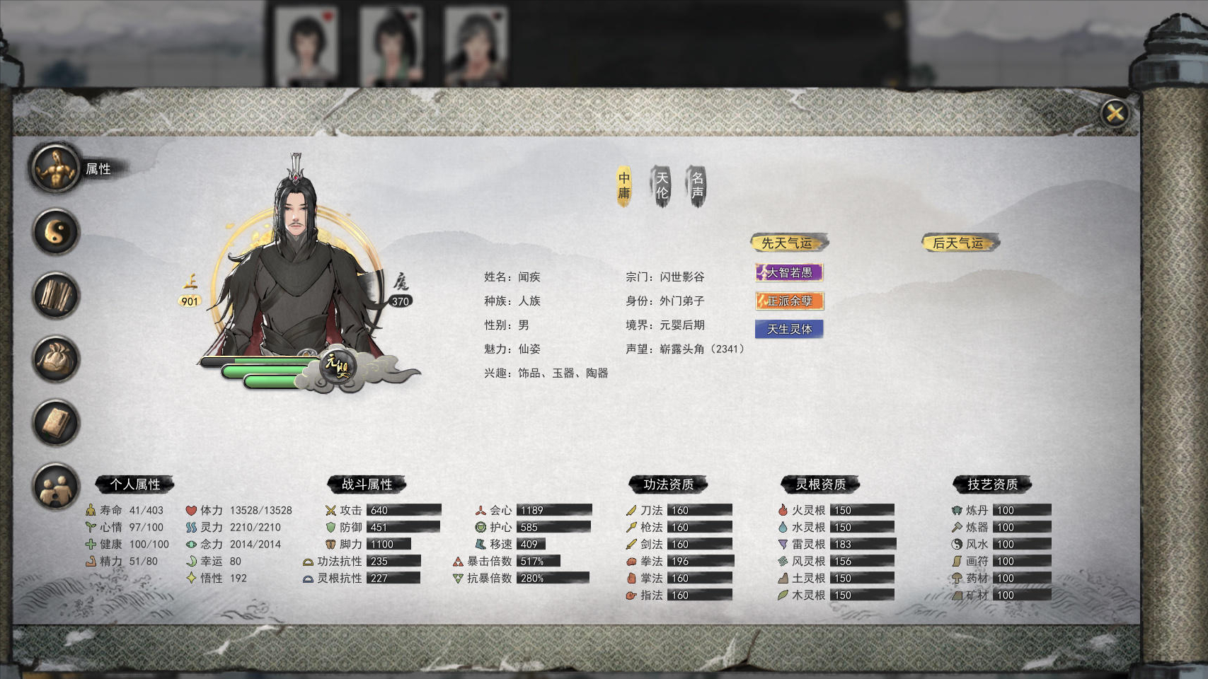 無論是小說還是電視劇或者電影,修仙之路真的打一開始就是條「漫漫長路」,這似乎從基調上就註定了《鬼谷八荒》必然是個讓人頭禿的遊戲。從小說題材方面來說,「仙俠」、「武俠」和「玄幻」它們之間有一定的區別,但作為遊戲而言,《鬼谷八荒》基本包含了其中所能想到的大部分元素。從一開始的捏人,繁瑣的屬性面板,光是看一下這個界面我們也能猜到沒有顆好肝,都不敢說自己是來修仙的。