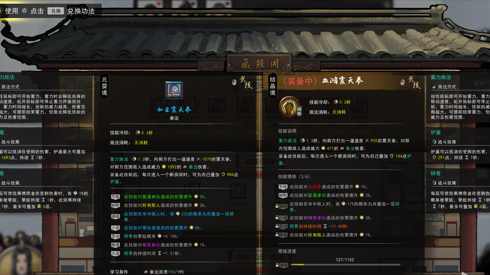 到這里修為的事情我們說完了,但是別忘了還有功法和資質,看下圖的一個直觀對比,「結晶期」的紅色(頂級)功法和「元嬰期」一個僅為藍色的功法(從差到好分別是綠色、藍色、紫色、橙色、紅色)。這兩本功法它們之間的輸出差距,大概是每一拳的傷害差距1121點,為自己疊加的護盾點數差距是840點,前期Boss血量也就是1788點附近。