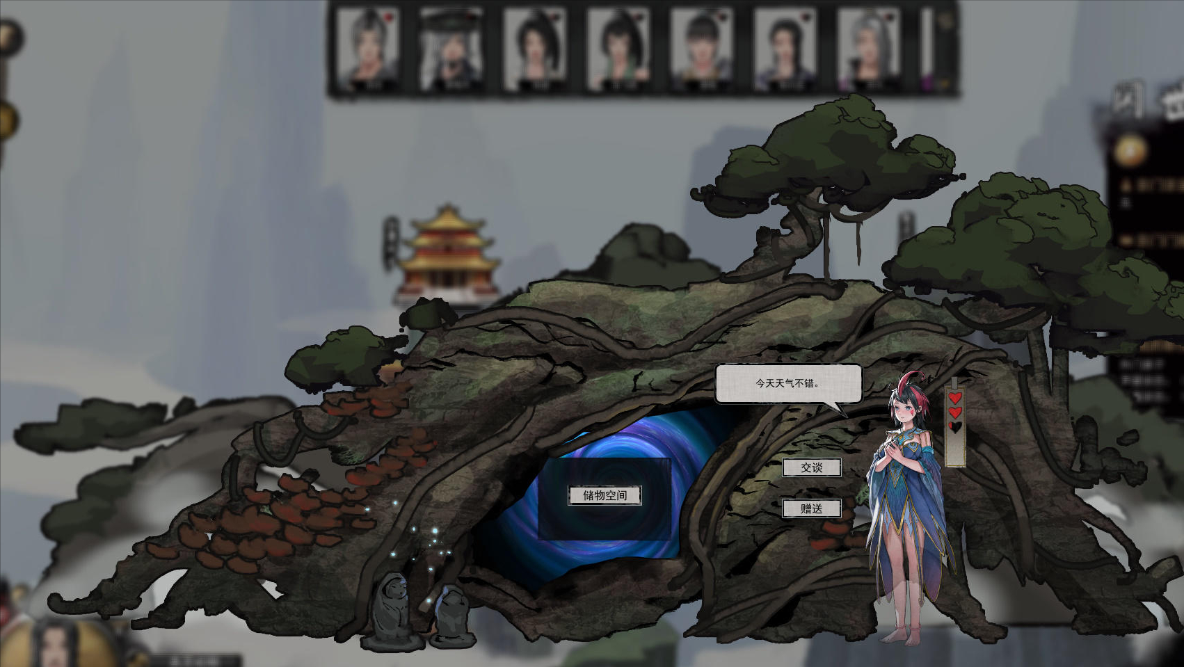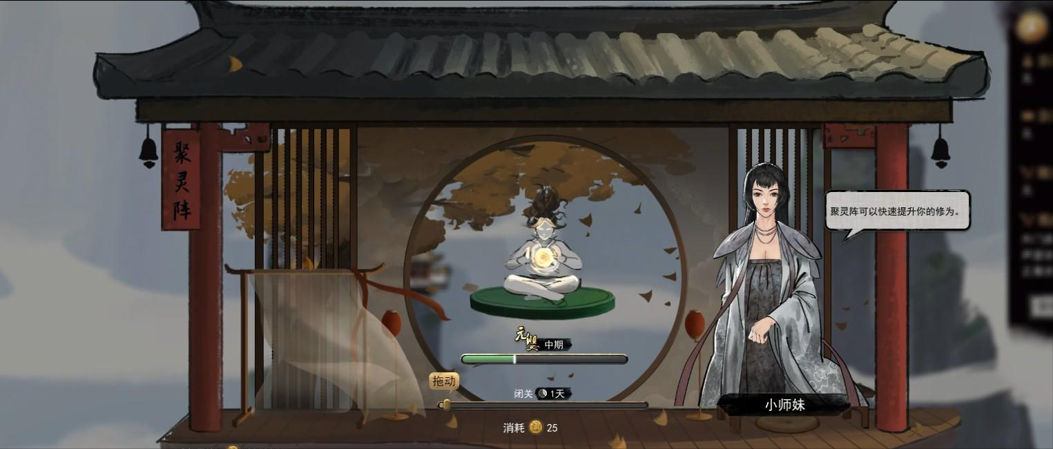 在大地圖上尋找風水寶地(冒著藍光的),在這種地方修鍊可以漲修為。但這個辦法有個大問題就是太慢了,因為太過於隨機,在大地圖上行走是要消耗時間的,用這個辦法,別說25歲,50歲都結不了丹。看看人家小說里的主角,再看看你,25歲還沒有築基,你這個…我…第二種辦法呢是地圖上的隨機事件,掉下懸崖獲得奇遇啊,靈獸相爭看得我修為大漲啊之類的,這個就更是可遇不可求了。最後才是主要的修鍊辦法,拜入宗門,使用宗門裡的聚靈陣,直接拖動就能消耗時間和宗門的「貢獻」來快速增長修為。