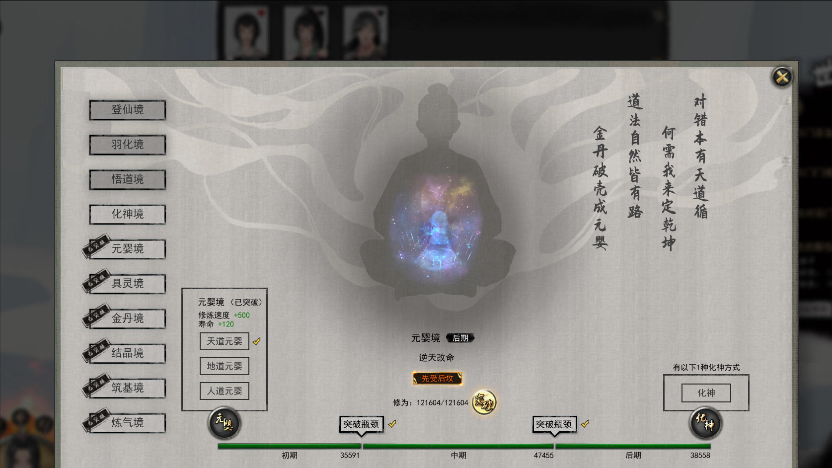 首先是修為分為十大境界(目前最高是到元嬰期,按照製作組的計劃更高等階會陸續開放),而每個境界里又分為「前期」、「中期」、「後期」。