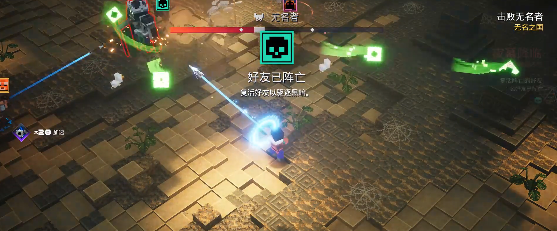 不得不說,《我的世界:地下城》的像素畫風就像是一層濾鏡,把這個原本黑暗、陰森、激烈的地下戰場變得清新明亮了起來。一掃暗黑like系遊戲低氣壓的特色,但又充滿著戰斗的緊張刺激感。友方陣亡以後會及時出現提示信息救助,倒計時也讓正在奮戰中的好友真切的感受到巨大的壓力;但同時死法的設置又很詼諧有趣,比如我跑慢了沒反應過來被門夾死了。同時打鬥過程的設計也很出彩,色系搭配和音效都和有氛圍。