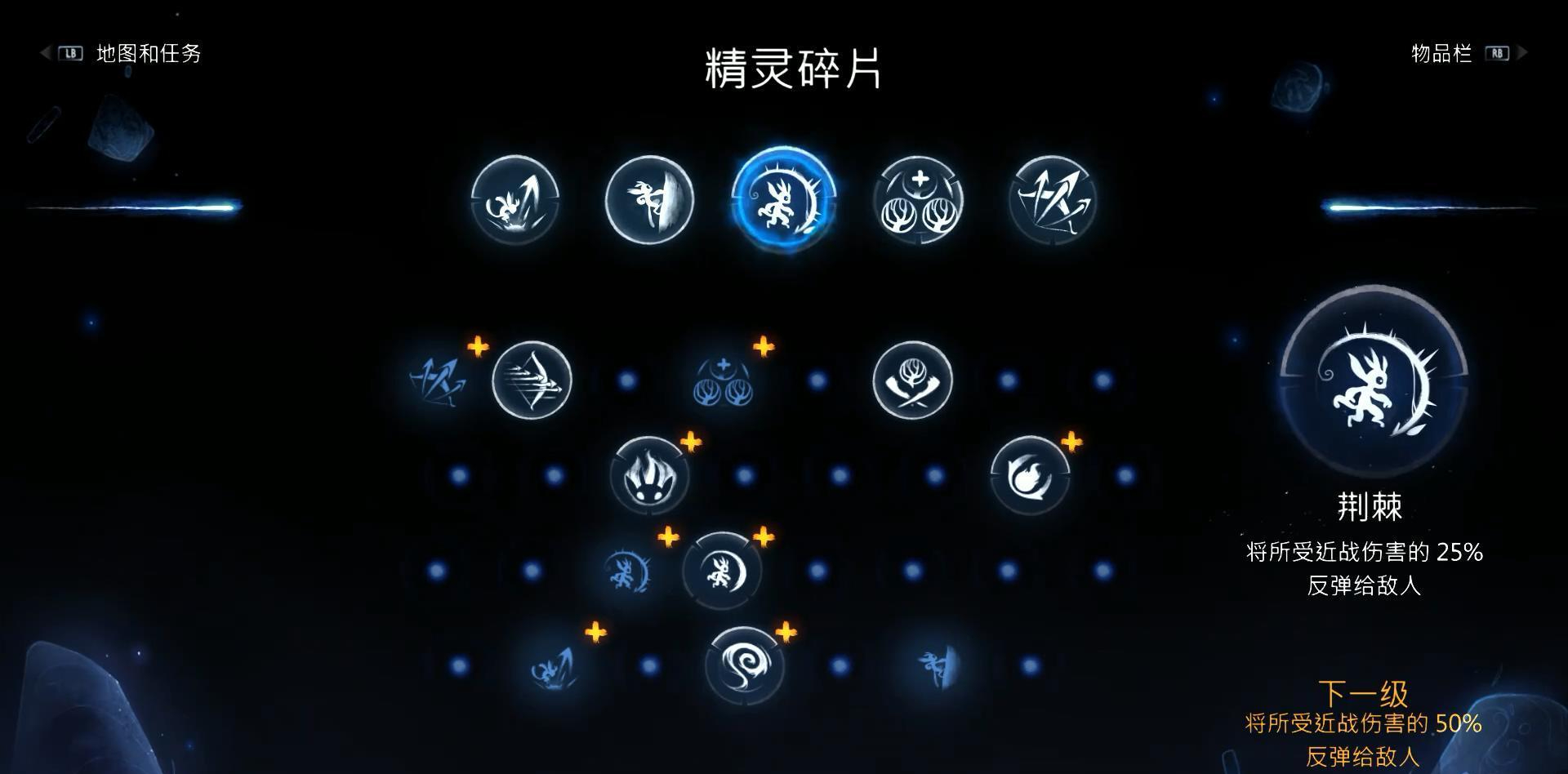 而除此之外本作也加入了相當多的技能以及類似空洞騎士的符文機制,包括鑲嵌符文(遊戲中叫精靈碎片)的符文槽也需要玩家在地圖上自行尋找,因此本作在探索收集方面要更加的豐富。