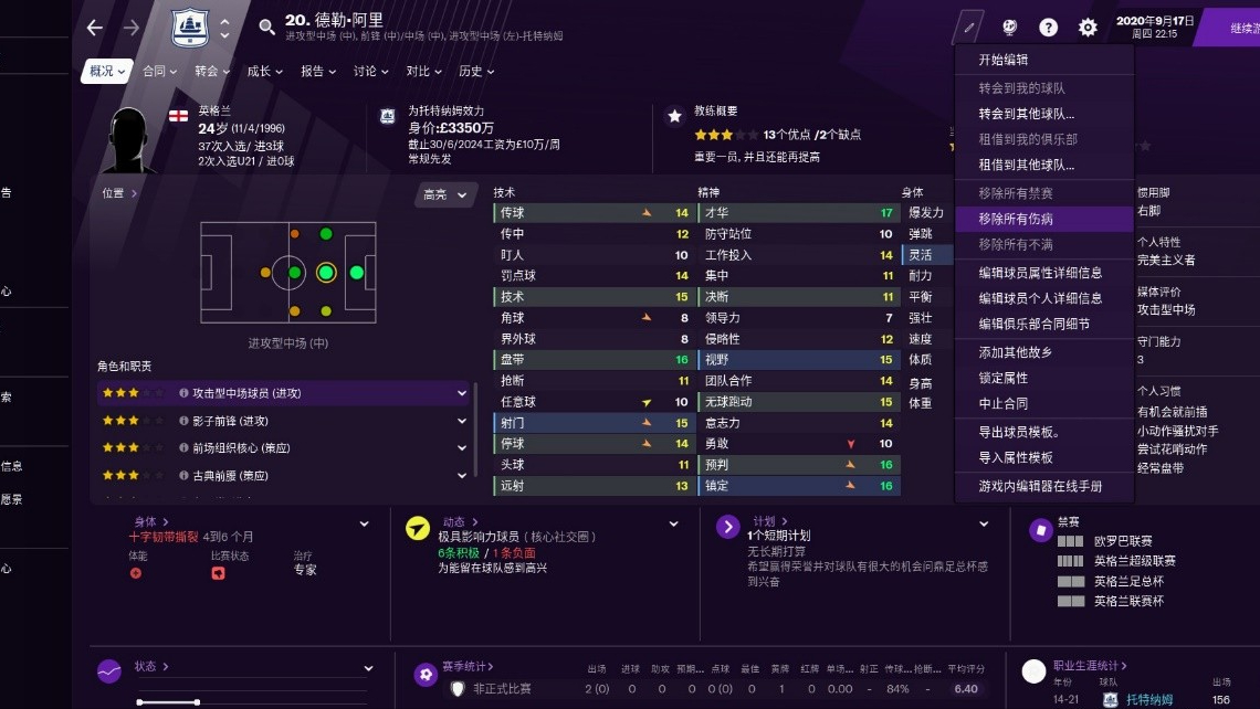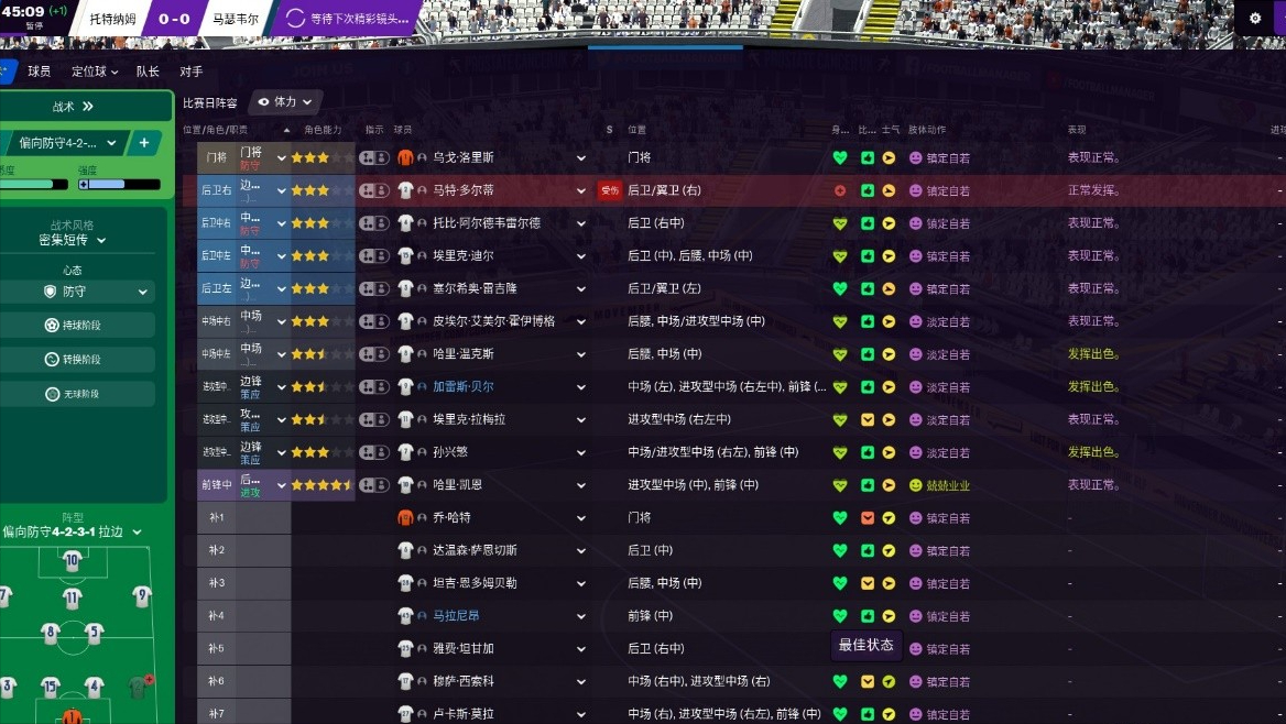 我知道阿里狀態確實不好,這個賽季在穆帥手下也不太受重用,但畢竟24歲還有很大的成長空間,縱觀真實世界的傷病史,之前也就最多手臂骨折、腿筋受傷罷了,這一上來給整個十字韌帶撕裂要不要這麼現實啊?FM你能不能就點到為止,不能這麼不講武德啊!在目前的《足球經理2021》中,傷病不是偶發性的而是持續性的,到了新賽季中途,我的陣容已經傷到沒法看了,排兵布陣捉襟見肘,都只能靠二隊打主力了,就游戲體驗來說受到了較大的影響。現在只能期待隨著後續版本的更新,數值穩定下來後傷病不再這麼離譜了,而目前的常規解決辦法也只有從賽季開始就多輪換、看到體力消耗過快就及時準備換人。