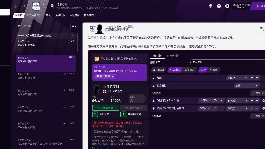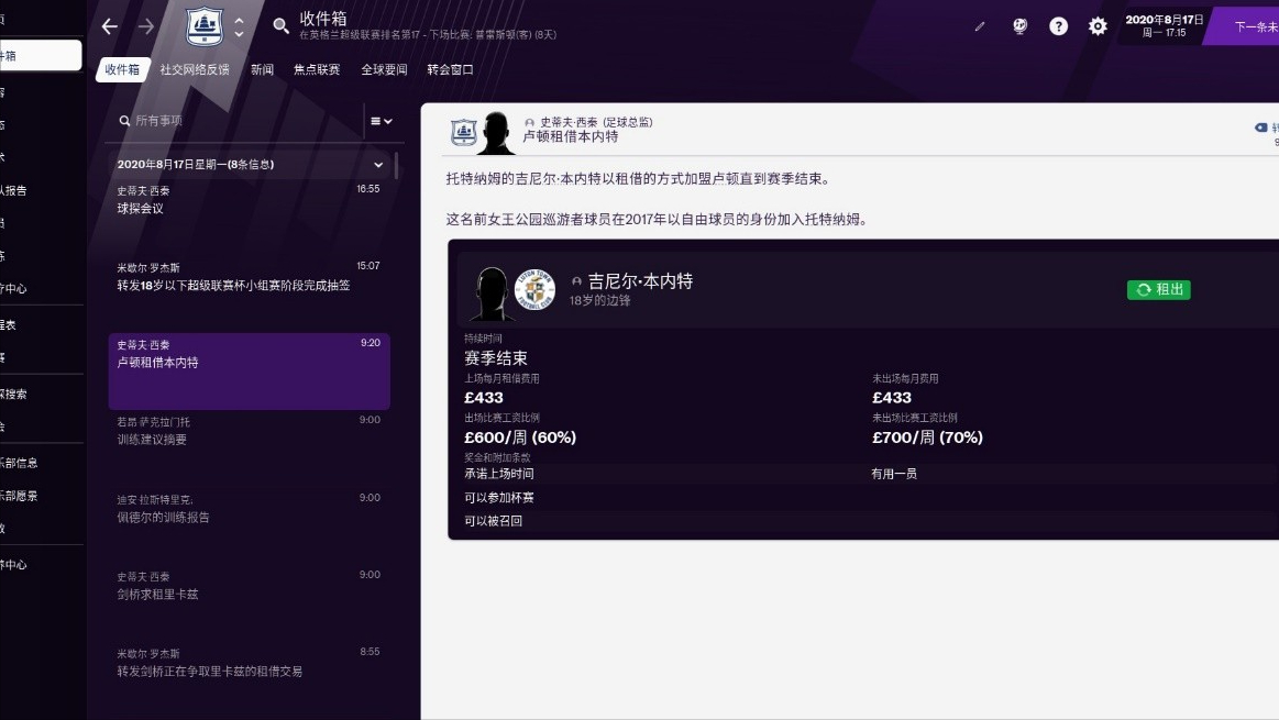 當然,如果您對陣型不太了解的話也無需擔心,《足球經理2021》中對每一種陣型及其細化都有詳細的特點說明。即使您暫時沒有鑽研的興趣的話,也可以參考助理教練的意見來進行陣型與人員上的安排。當然,作為英式教練,不僅要安排訓練、打好比賽,在轉會方面也得多花心思,我個人是屬於混亂善良陣營,一方面考慮轉會、租借的價格,另一方面考慮的是球員意願和未來發展,為了區區幾百萬磅的轉會費把當打之年的球員賣到中超來這種事是干不出來的。