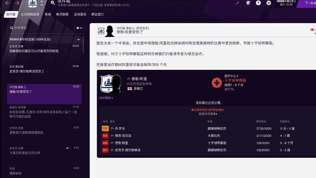 在《足球經理2021》中,讓我感覺比較離譜的就是「傷病」元素了。目前版本的「傷病」給人的感覺是完全脫離了真實情況,讓坐在電腦屏幕後的玩家真的忍不住想要吐槽。就拿我個人的體驗來舉例子,我先前的熱刺檔進度才到8月初,就已經傷了4個球員,我一共就踢了兩場友誼賽啊!我訓練也沒怎麼安排啊!就單單是第二場友誼賽,就給我整下去兩個隊員,一個傷2-3周,一個傷5-8個月,來欺負我一個20歲的新教練,這好嗎?這一點也不好啊!特別是傷5-8個月的還是24歲的阿里,還是十字韌帶撕裂這種足以毀滅球員職業生涯的傷病,就更離譜了。
