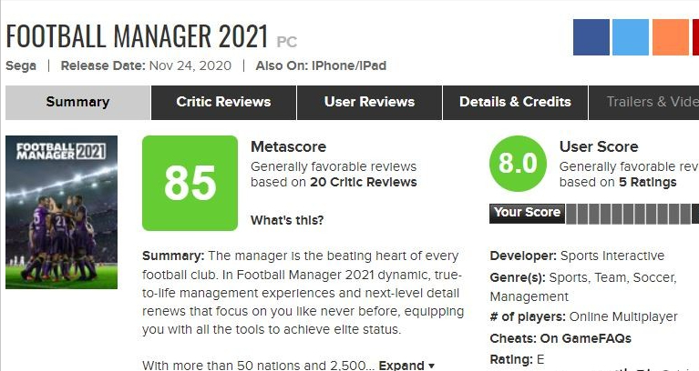從1993年到2020年的27年間,Sports Interactive持續深耕,不斷提升游戲體驗,為他們贏得了一大批粉絲,包括很多足球從業人士也是他們的忠實擁躉,甚至如著名教練「狂人」穆里尼奧和「索聖」索爾斯克亞都非常鍾愛《足球經理》系列。因此,2020年11月24日正式發售的《足球經理2021》理所當然也是不負眾望,metacritic上20家媒體評分均分85分,steam商店也有超過2000份評價有93%的好評率,總體特別好評。