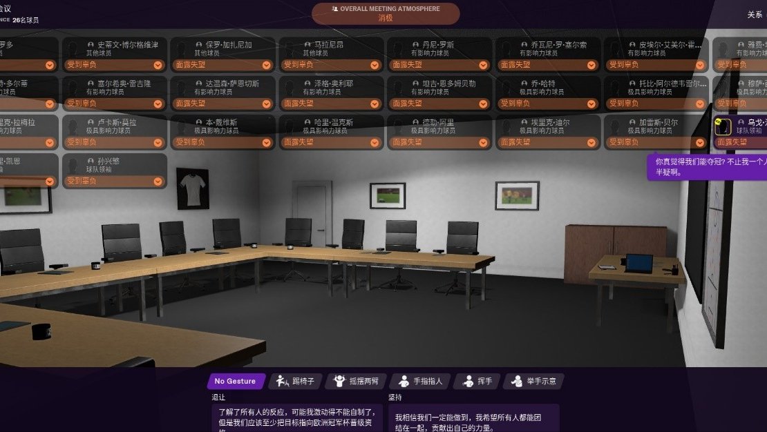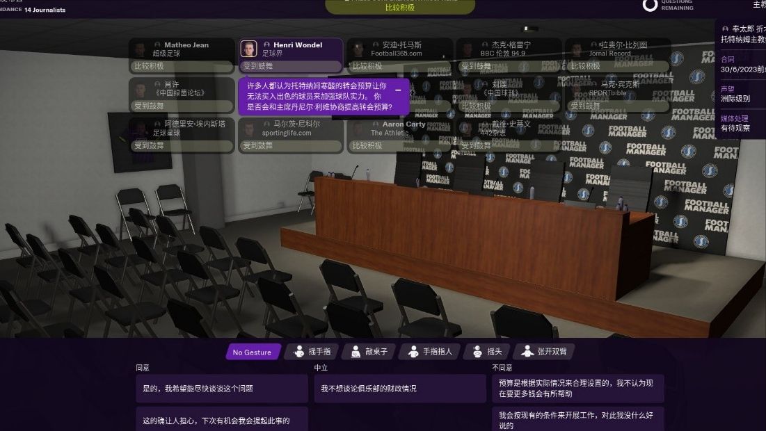 除了處理足球事務外,人際關系也是一個優秀教練需要特別重視的。通常玩法下,我們需要與管理層、球員、媒體打好關系,獲得他們的支持。管理層會有各種各樣的願景和長期計劃,儘可能接受並落實從而獲得較高的管理層滿意度。與球員們見面後確定賽季目標,通過語言與動作來鼓動士氣,要注意目標不能定太高,比如雖然現實中熱刺的狀態已有爭冠的態勢,但在游戲中選擇爭奪聯賽冠軍為目標的話,球員們反而會覺得實現不了開始失望。同樣,對待媒體採訪要得體,在一個較積極的氛圍中有技巧的回答各種問題,從而讓報道比較正面。