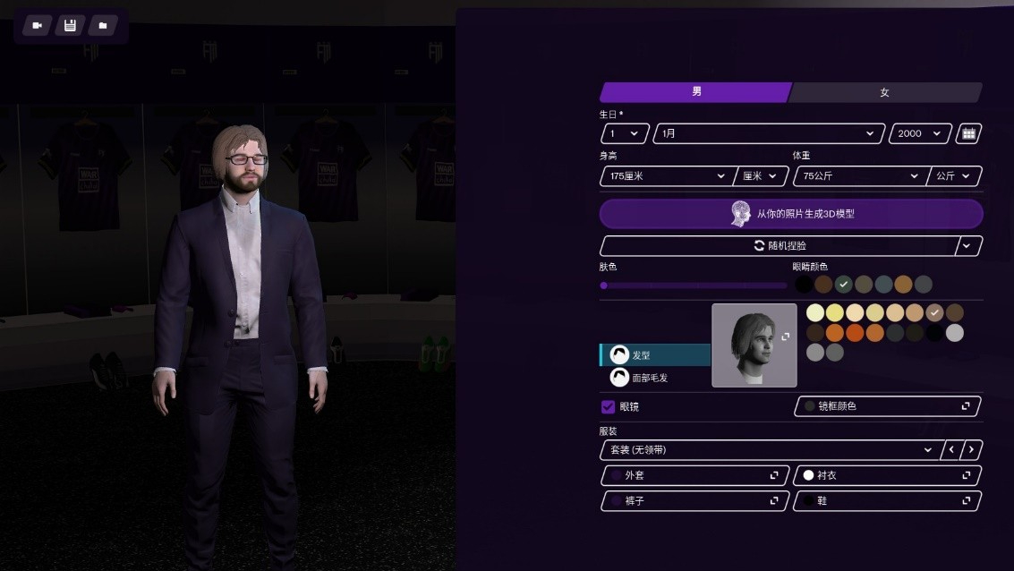 在作為教練走馬上任之前,玩家需要做的最重要事情就是打造出來一個自己滿意的形象。在《足球經理2021》中,Sports Interactive自然提供了比較完整的捏人功能,玩家可以按照喜好設定性別、年齡、身高、體重等基礎信息,也可以對膚色、瞳色、髮型、及面部毛髮色等等進行精修,而在服飾上除了傳統的西服外也有運動裝可以選擇,作為配飾的眼鏡也同樣可以調整鏡框顏色。雖然可自定義選項並不像很多RPG那麼誇張,但也算是功能強大、頗有亮點了。當然如果您覺得麻煩,也可以讓系統來隨機生成,不過成品質量就比較值得商榷了,可能不太符合亞洲玩家的審美觀。