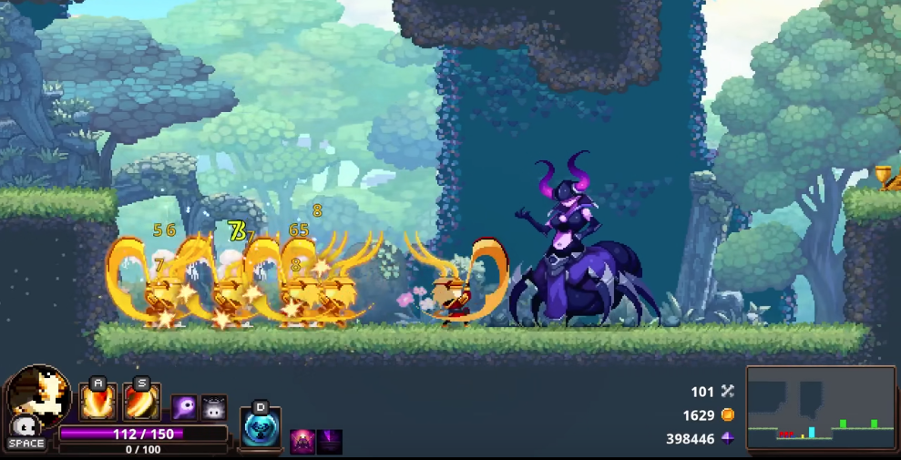 2021年正式上線的橫向捲軸的roguelike遊戲《小骨:英雄殺手》給我留下了很深的印象(簡稱小骨)。《小骨》中的多樣性除了裝備的套裝效果與精華技能的多元以外,最大的特色,是可以通過切換不同的頭骨變身為不同的職業,且頭骨本身可以進化與升級,與《哈迪斯》有著異曲同工之妙。但不同點在於,《小骨》的劇情單一且腳本化,在人物對話方面並沒有耗費多少工夫,一心將精力扎進玩法多元化中。
