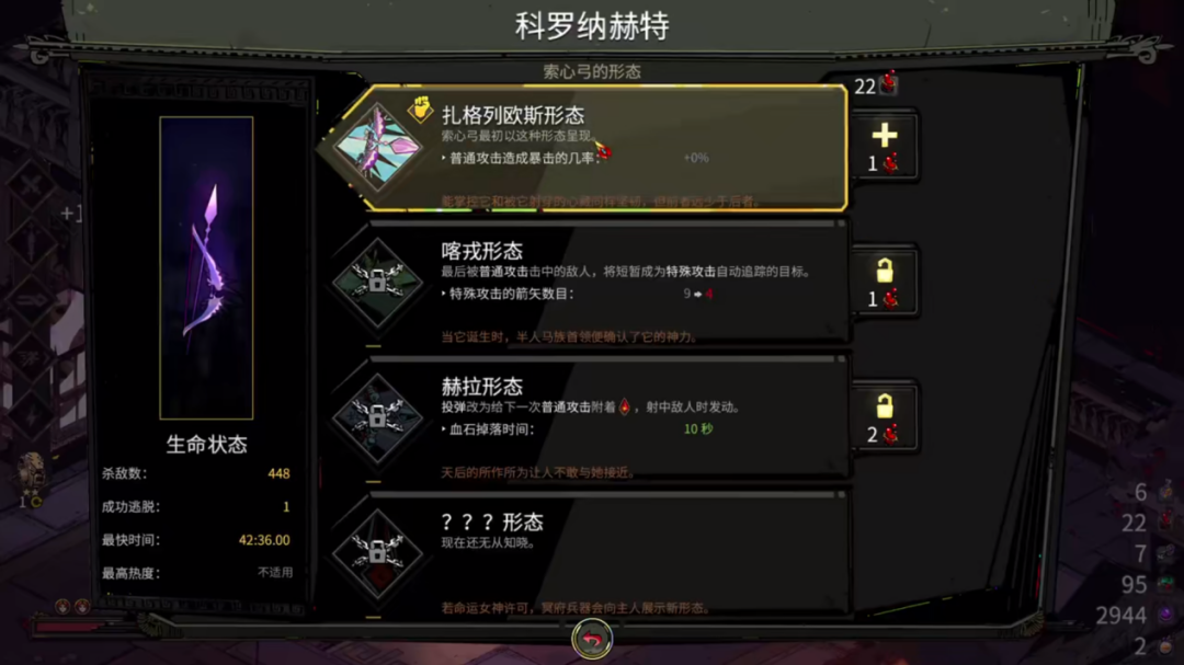 SuperGiant Games同樣對這個問題進行了處理。《哈迪斯》武器雖然並不算多,但戰鬥系統相較於roguelike來說要相對複雜,這同時也是《哈迪斯》出彩的原因之一。不同的武器的區別首先在於戰鬥方式的差異,長劍會擊退,弓箭需要拉扯,盾牌可以格擋,長槍遠近兼顧,選擇了一種武器等同於選擇了一種「命運」。