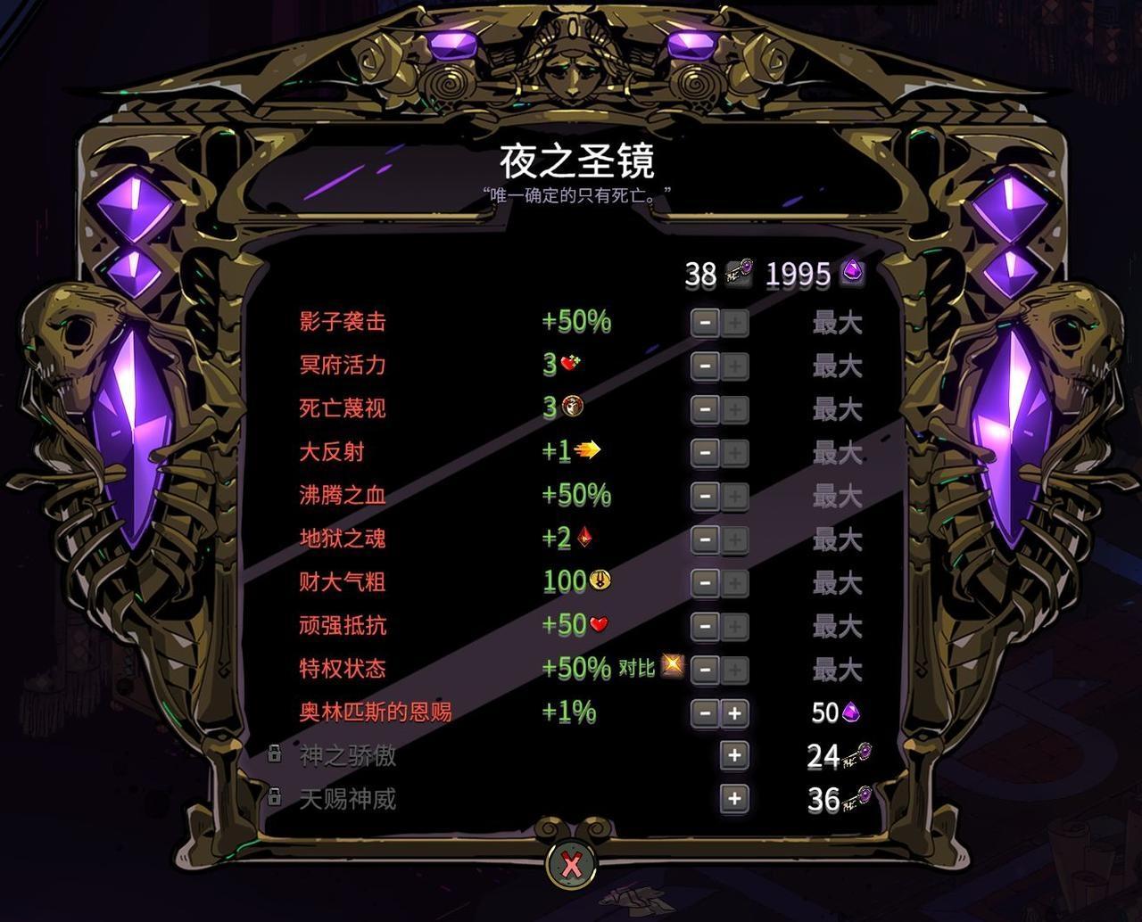 與武器系統緊密結合的是角色養成系統,黑暗寶石、鑽石、冥府鑰匙等死亡後保留的永久性資源可以簡單粗暴的提升主角的實力,讓遊戲通關變得越來越容易。