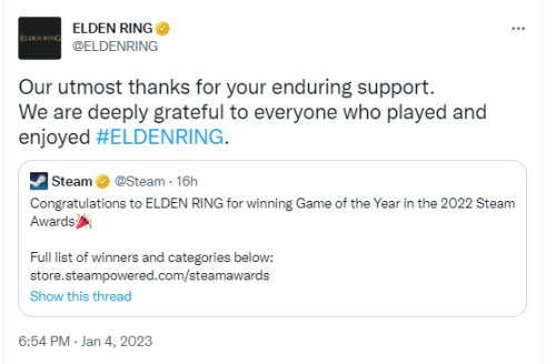 1. 《艾爾登法環》官方發文致謝獲得 Steam 年度大獎