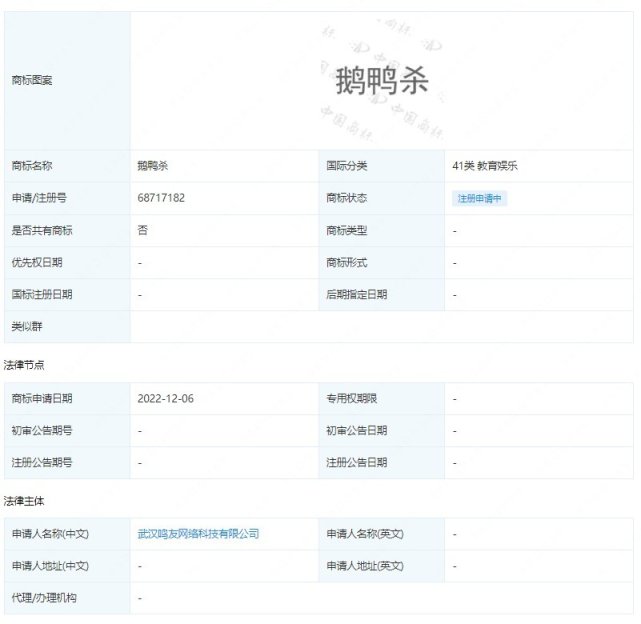 另外有趣的是,《鵝鴨殺》的商標已由武漢鳴友網路科技有限公司提交商標申請,注冊商標的武漢鳴友網路科技有限公司是武漢微派網路科技有限公司的全資子公司,後者也是手游《貪吃蛇大作戰》的運營方: