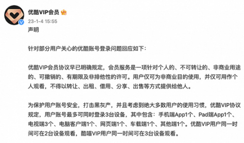 1月4日下午,優酷VIP會員官方微博發布聲明稱,為保護用戶賬號安全,打擊黑灰產,並且考慮到絕大多數用戶的使用習慣,優酷VIP協議規定: