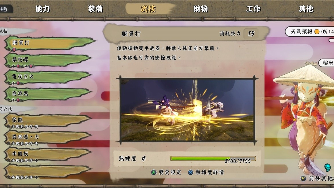 隨著佐久名務農時間的增長,領悟到各種技能後,搭配上探索中找到的各種技能書,戰斗的元素會變得越來越豐富,加上本來操作性就很高的羽衣系統,玩家可以在山腰處武神的試煉場中進行練習,完成各種實用又具有觀賞性的連段。