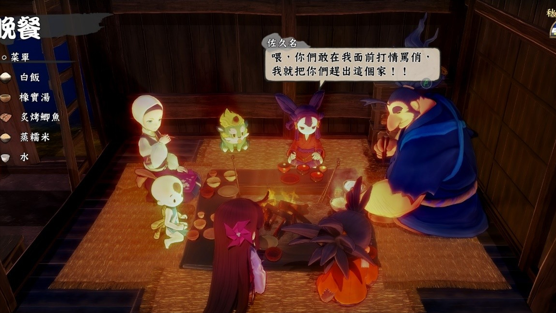 在經過新手教程後,第一個boss是佐久名父母的舊部,一名葦隱族。來到了父母在山頂搭建的木屋後,佐久名就要開始田園生活了。除了要照顧自己,還要保證身邊幾位凡人的安全,因為沒辦法指望凡人,所以打獵的重擔也到了佐久名身上。由於佐久名身份的原因,水稻的成長可以提升自己的力量,於是本作的另一個玩點就是種植了。在每一天中,玩家都能自由選擇出去探索打獵,或者留在家裡務農,遊戲中的時間也會根據規律前進,玩家需要合理分配時間安排,因為到了晚上不但視野差,妖怪也會變得非常凶暴。