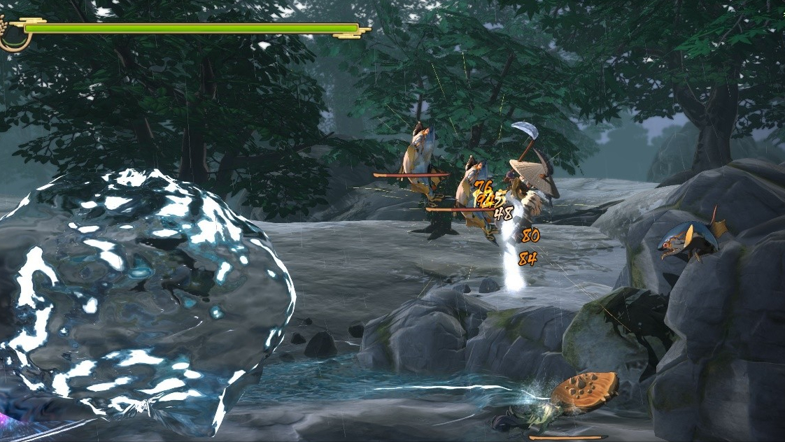 遊戲的戰斗部分比較容易上手,和一般的動作遊戲比較相似,利用輕攻擊、重攻擊以及特殊技能組合出各種連招。比較特殊的操作是佐久名的羽衣,也就是身上飄帶的使用,可以用於抓取牆壁,同時也能抓拋妖怪,同時能解鎖更多操作。羽衣也是本作動作元素中最重要的操作,用得好可以讓戰斗的節奏變得非常快,視覺效果也會非常好。