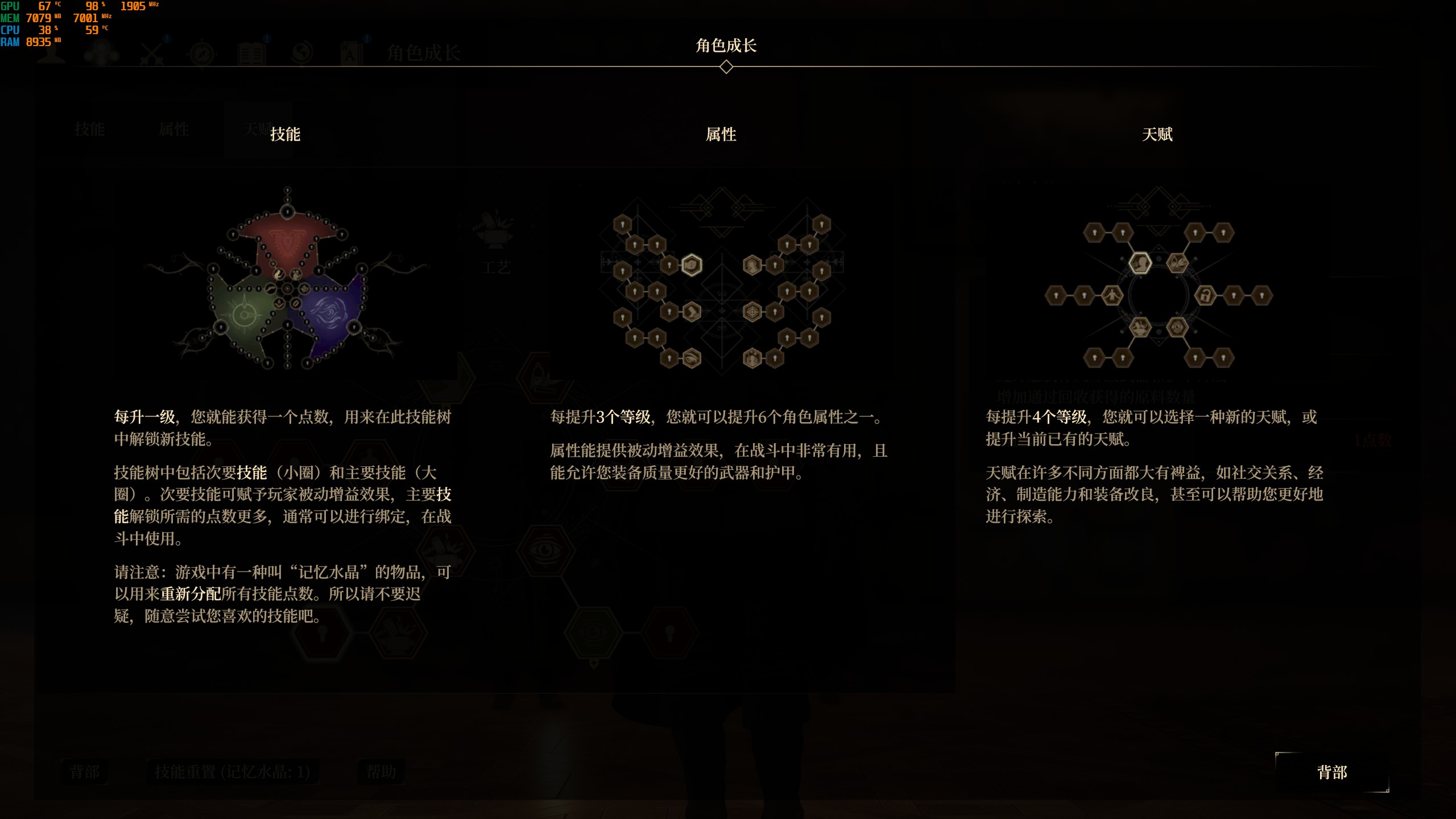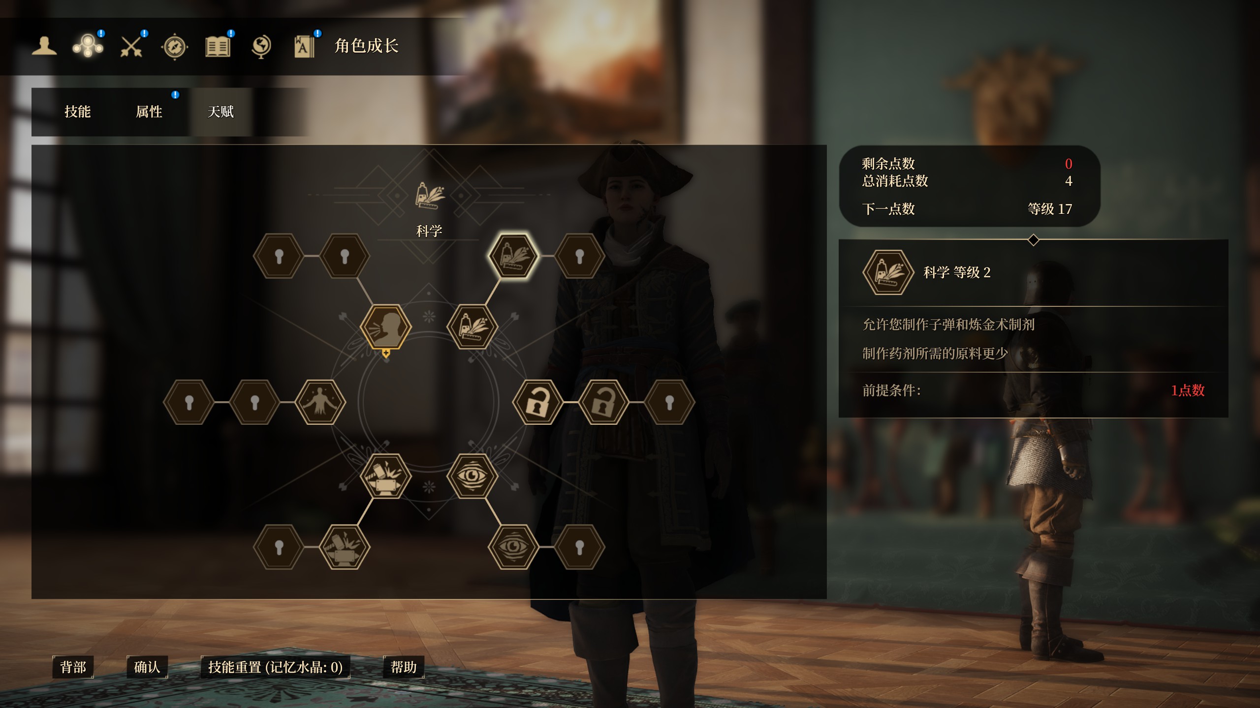不過要注意的是一旦重置,技能、屬性、天賦還有主角已經裝備的武器和防具都會一並重置,雖然自由度很多高但卻繁瑣,所以還是建議遵循系統的提示來進行分配。不過並沒有說就限制死了分配模式,只是系統建議的分配是比較合理的。比如筆者初期選擇的是法師,但是天賦卻沒有點了法師最需要的科學,由於法師攻擊消耗魔法,雖然能夠無視護甲造成高傷害,但是回復速度慢,如果沒有充足的葯劑補充很難發揮法師的長處。加上前期商店內的葯劑價格十分地奸商,性價比完全比不上點亮科學天賦後能夠進行原料採集加以合成地葯劑,所以無論你選擇哪一個職業定位遊玩,筆者都推薦初期點亮科學天賦第一等級。