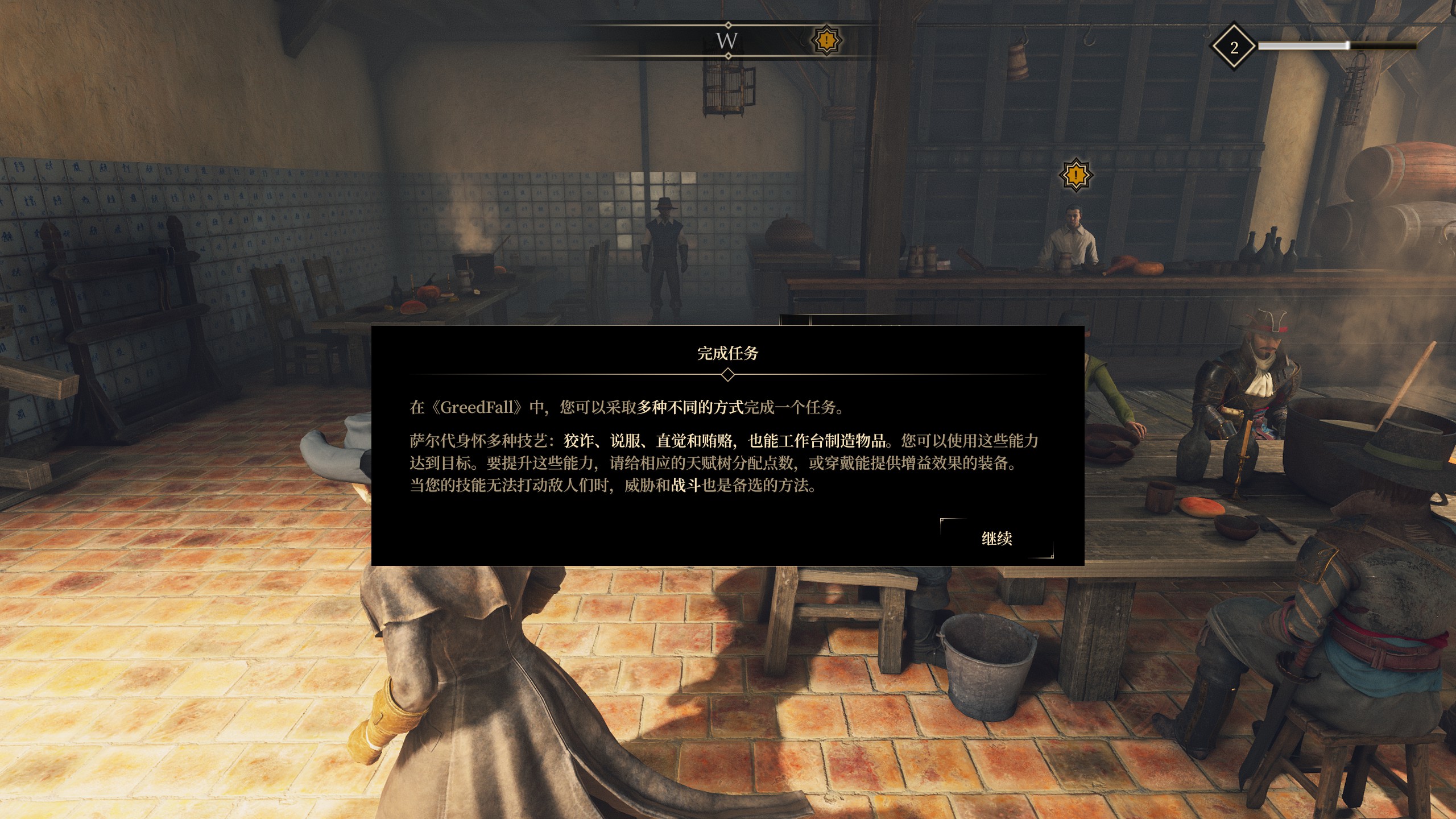 在進行不同的任務時,可以使用的方法也不再限制於單調地戰鬥,你可以選擇潛行,也可以使用天賦能力將其說服,或者使用金錢賄賂,避免發生無謂的戰鬥。但是當這一切都無效之時,這就不要顧慮太多了,抄起你手中的榔頭錘就直接開打吧。遊戲中的等級裝備壓制依舊是存在的,在探險過程中玩家如果遇到十分強大的敵人,無論是怪物還是人類都應該選擇避戰,悄悄逃走,等到有足夠的裝備支撐再回來報仇也不晚。