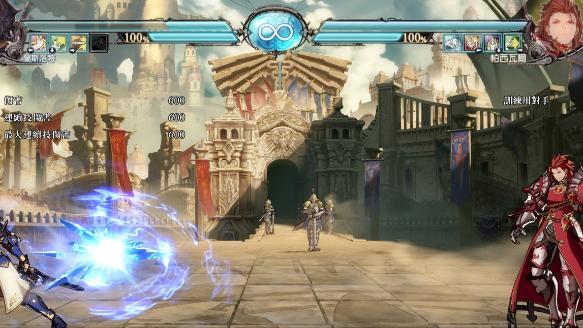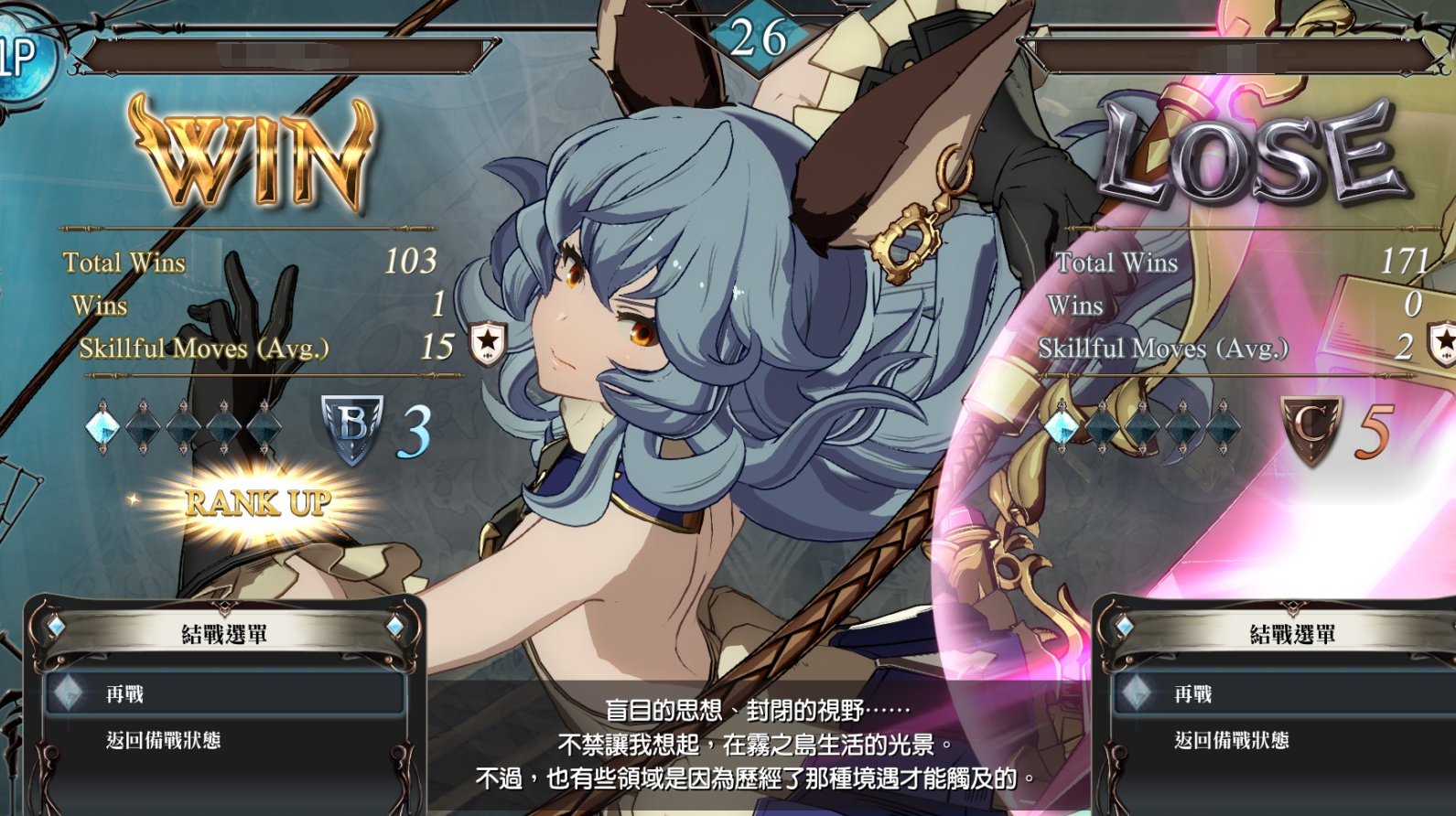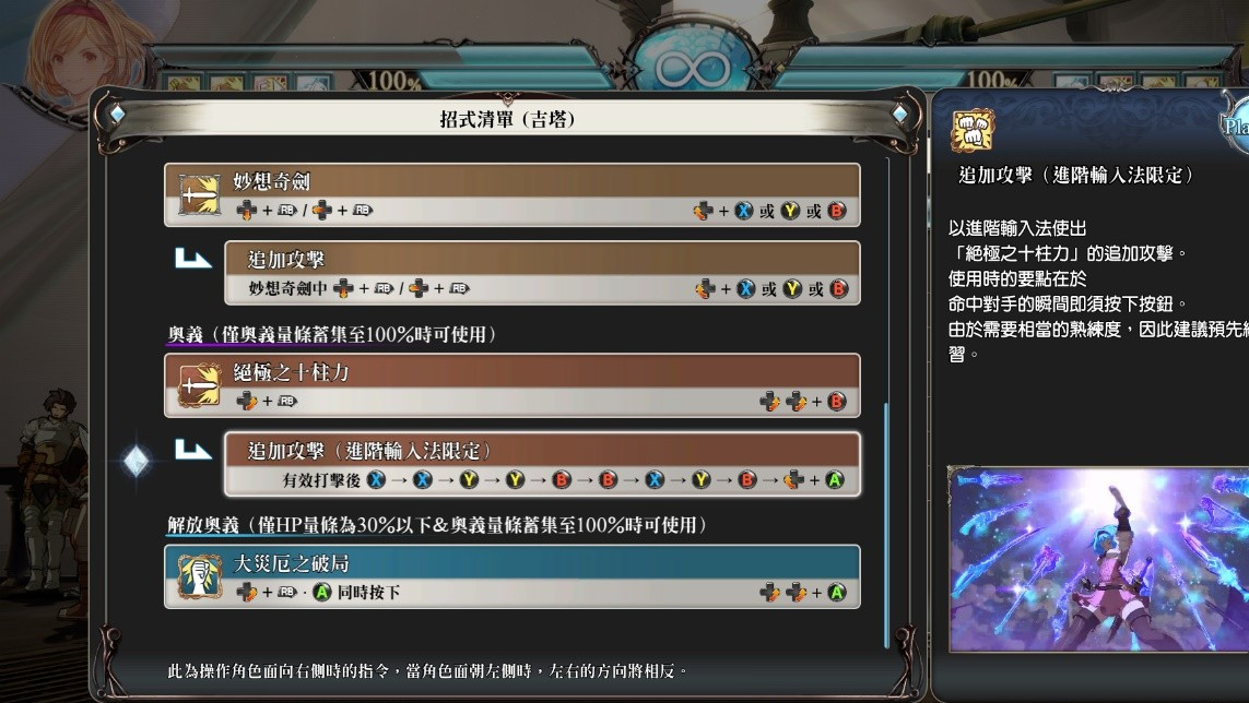 那麼同為Arc System Works的作品,《碧藍幻想 VERSUS》的表現究竟如何呢?游戲本體共有11名角色,算上DLC一共有19人,人物在絕大多數格鬥游戲中算比較少的。不過最直觀的差別在於,游戲的出招表極其簡短,除去部分人物的派生技,一個人物只有3-4個技能。對於格鬥苦手來說,簡潔的出招表無疑是好消息,但本作的獨特機制同樣規避了單一技能濫用的情況。