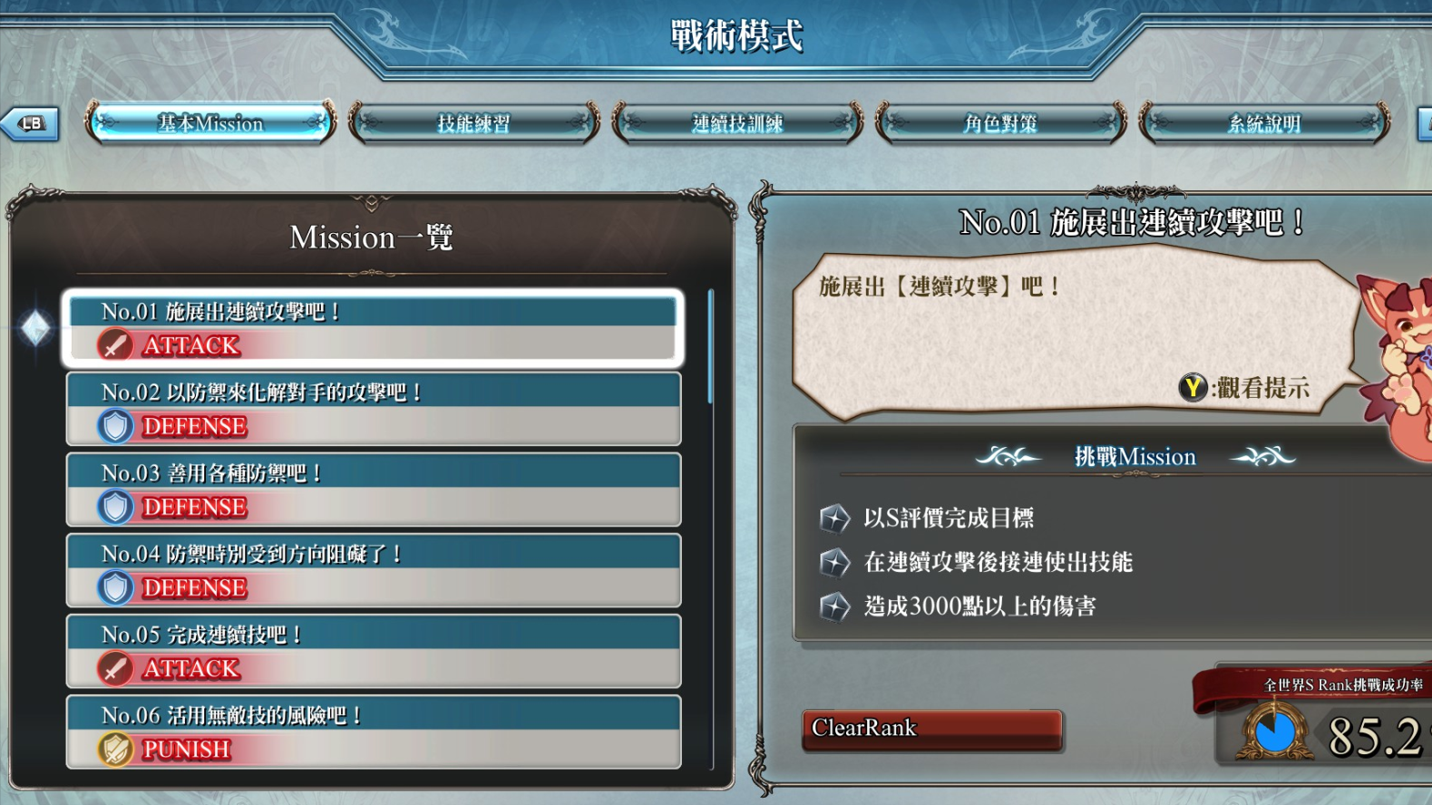 當然最讓騎空士們滿意的,還是RPG模式的內容上,劇情還原了原作故事,玩家可以重新體驗自己走出新手村的過程,昔日的boss也會一一登場。此外《碧藍幻想》中最重要的共斗元素也是不能缺席的,玩家在走完教程關後就可以2人組隊一同戰斗,可以自由分配2人的控制模式,全電腦控制或者本地雙人聯機,甚至還可以網路聯機,攻略遇到困難時請求援助。游戲的玩法是類似於街機游戲中的橫版捲軸過關,但是與星晶獸們的boss戰役帶來的視覺衝擊足以讓原作玩家當場真香,不但全部3D化,並且游戲中的出招方式也全部還原,絕對能有不輸給原作時的熱血程度。