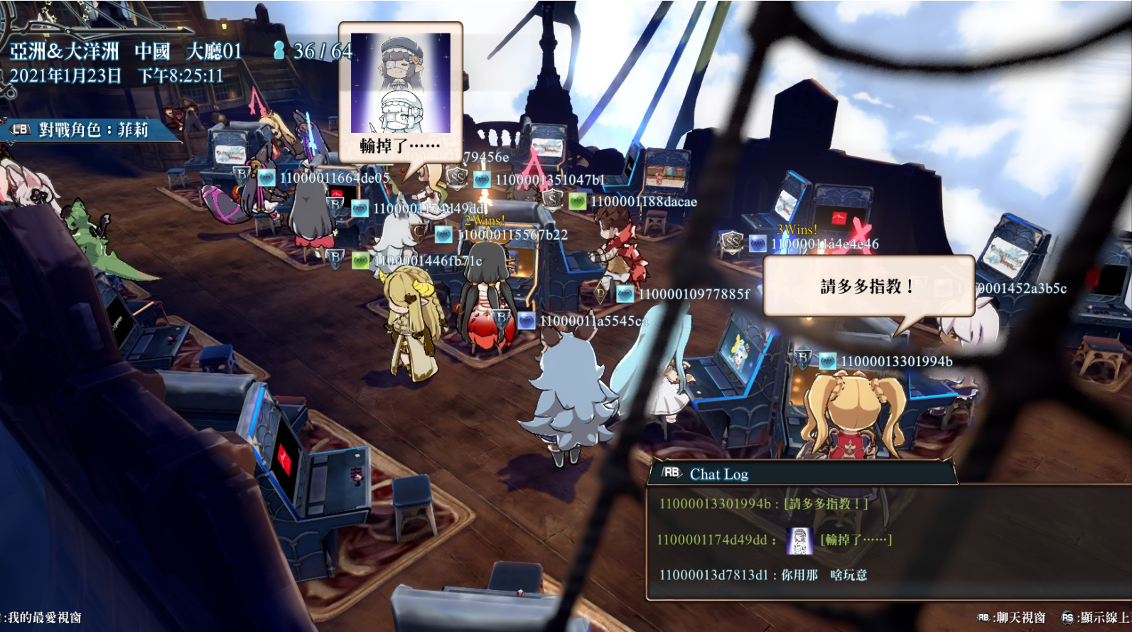 本作中有著和《蒼翼默示錄: 交叉組隊戰》一樣的大廳系統,玩家可以在游戲中利用代幣購買大廳形象,選擇想挑戰的玩家,坐在他的機位旁邊即可開始對決。作為格鬥游戲來說,本作的聯機體驗很不錯,國內大廳非常流暢,不需要任何加速器。網路比較好的玩家也可以自行選擇不同國家的伺服器,與來自世界各地的高手進行對決。