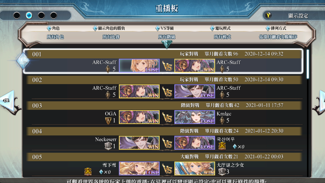 rank等級最低為F,而突破SSS後就能進入最高的master段位,,不過偶爾也會匹配到rank不一樣的玩家。作為獎罰補正,戰勝同rank或者高rank的玩家可以獲得一顆晶石,戰勝低rank玩家則是只有半顆。輸給同rank或者低rank玩家會失去一顆晶石,輸給高rank則是只失去半顆。每階rank共有5個階段,每次集滿顆晶石進入下一階段,結束最後一個階段後就會開始晉級賽,在5局中獲得3局勝利即可提高rank等級。