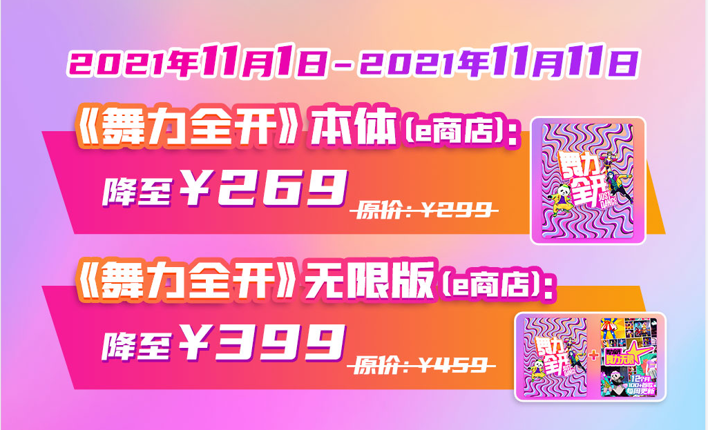 而國行《舞力全開》因為版號原因取消作品主體的版本更迭,用訂閱服務提供內容更新,對於我們這些國行NS玩家來說就成了一種優惠,恰逢「雙11」,國行也正在打折促銷,遊戲本體僅269元(原價299),購買本體送1一個月「舞力無限」訂閱服務,而一年「舞力無限」訂閱服務當前也僅需要169元,相較於官方售價60美元的《舞力全開2022》,可以說就是以不到一半的價格玩到了新作,更何況,該訂閱還根據不同情況提供了日、月、季、年等不同時長的購買選擇,可以讓你根據自己的實際遊玩情況選擇購買,這對於我們已婚男人有限的零花錢來說,在購買決定的選擇上無疑起到了一錘定音的作用。