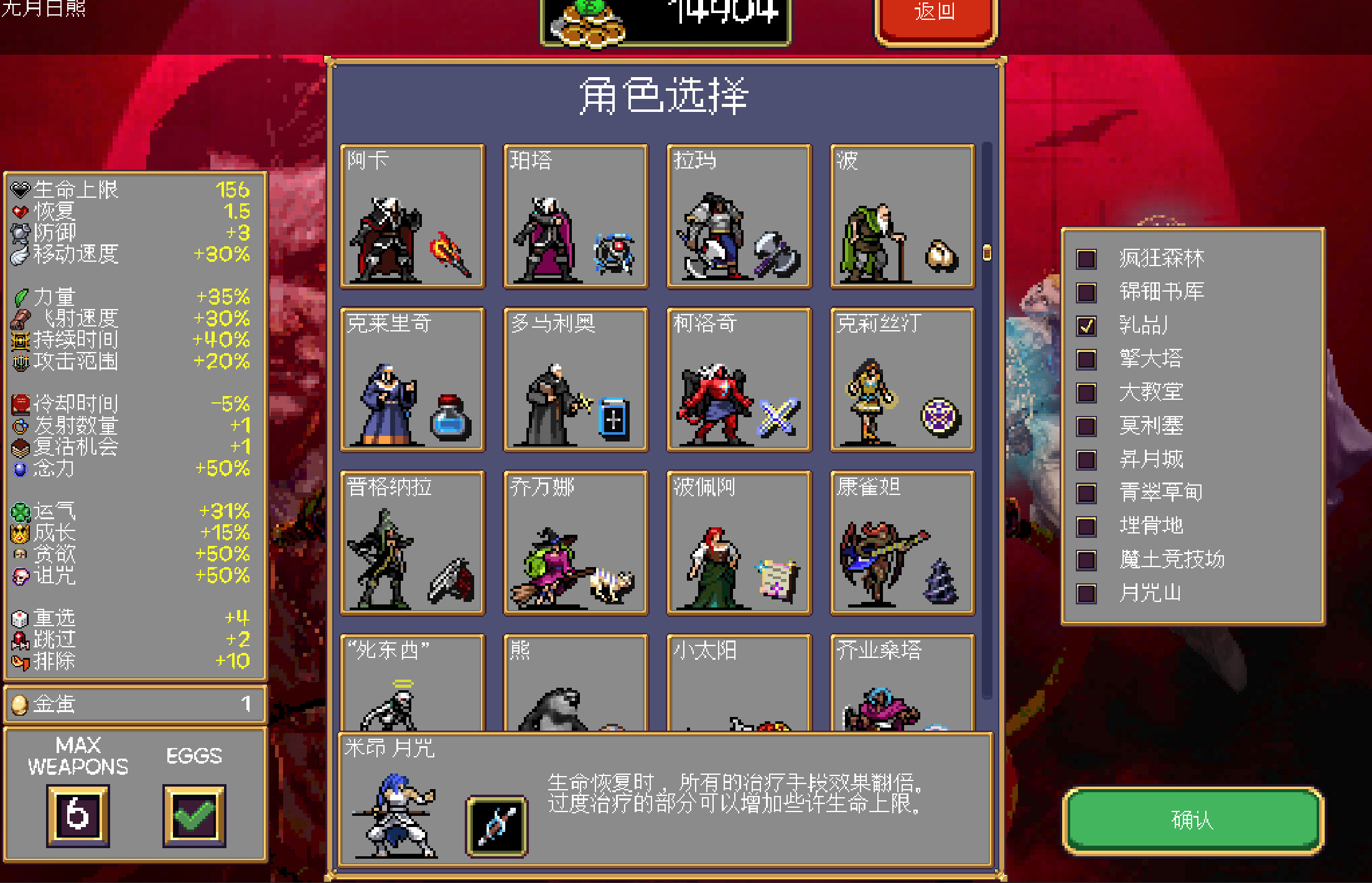 最有特色的是月咒山這張地圖,在《吸血鬼倖存者》中,很多地圖只在幾個特定地點放置了關鍵道具,然後整個地圖,是基於某個部分的無限重複。就和紅白機玩《荒野大鏢客》那個無限地圖的感覺差不多。這也是我認為它很像4399的一個原因。