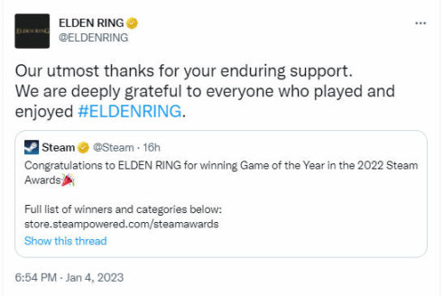 《艾爾登法環》獲得2022年Steam年度遊戲大獎,官方發文感謝大家的支持