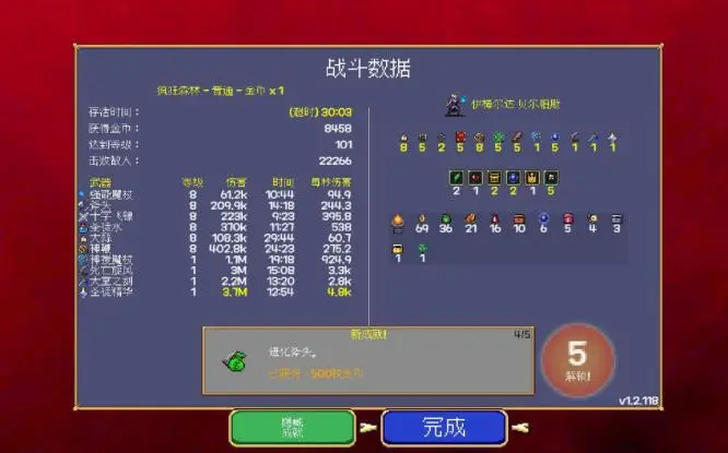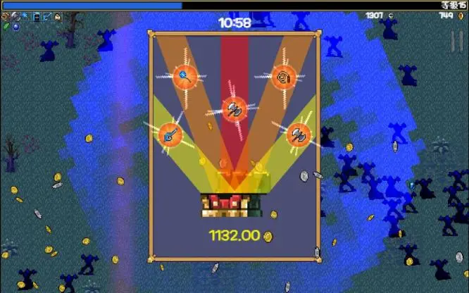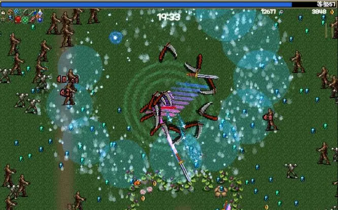 然後遊戲有著「畫龍點睛」的一筆,那就是在普通武器升到滿級之後,如果包袱里存在著對應配方的輔助道具,那麼接下來一次開寶箱時(普通升級不行,必須要擊殺精英或者BOSS獲得的寶箱),就會獲得「組合超級武器」——超級武器的效果堪稱毀天滅地,比如聖水與吸取範圍的組合武器效果是產生跟隨玩家移動的DOT池子,一下就從價值有限的隨機抽獎搖身一變成為了幾乎是價值最高的超級武器,斧頭與燭台的組合同樣是完全「質變」的效果——變成360度穿透的死亡鐮刀攻擊(BTW部分武器和超武相對孱弱也是目前遊戲還存在的問題)。