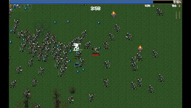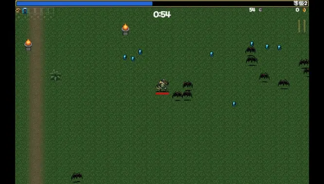 《吸血鬼倖存者》也不例外,最開始我們可以選擇一個使用鞭子的英雄進行攻關,遇到的蝙蝠敵人也很弱——遲緩、脆弱、只需要一次攻擊即可擊殺,即便碰到了我們的英雄,也對血量產生不了太大的威脅。但很快玩家們會發現事情並不簡單:殭屍、骷髏、食人花與巨型螳螂等等越來越強大的敵人開始出現,怪物產生的速度越來越快、密度越來越大、強度越來越高,而我們的火力提升速度卻難以與之匹配,於是力戰不敵幾乎成了定式。